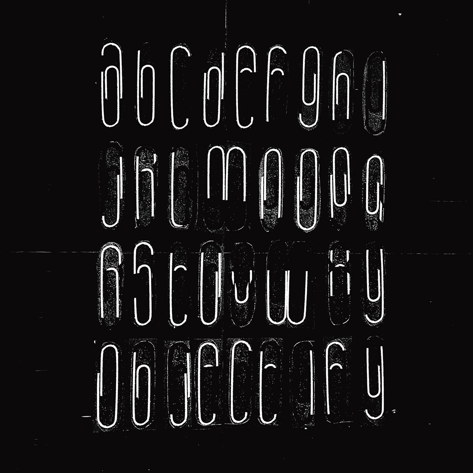 Família tipográfica criada usando apenas um clips de papel, uma caneta piloto e máquina Xerox. Trabalho desenvolvido no curso Experimental Typography do London College of Communication.